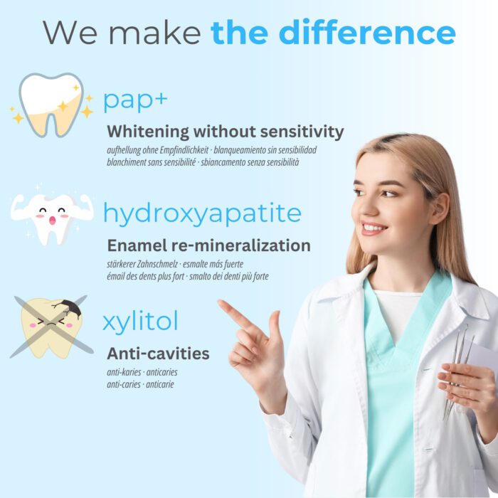 These PAP+ whitening strips offer a professional-inspired dental whitening treatment without peroxide, formulated to be gentler on sensitive teeth and enamel. Infused with PAP+ (Phthalimidoperoxycaproic acid), hydroxyapatite and xylitol, the strips work to gradually lift surface stains while supporting enamel remineralisation and moisture balance.