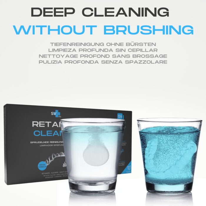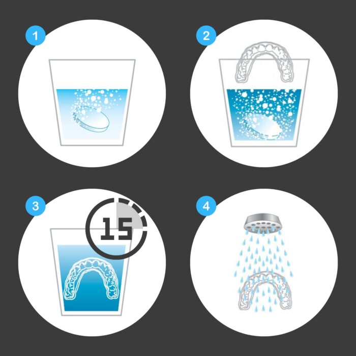 They provide deep cleaning without the need for brushing. The unique formula with bicarbonate and active oxygen acts exclusively on organic residues — tartar, plaque, dirt, and stains — without damaging the orthodontic appliance, and is fully suitable for devices with metal components.